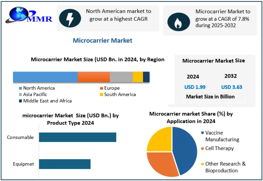 The Global Microcarrier Market was valued at USD 1.99 billion in 2024 and is projected to grow at a CAGR of 7.8% from 2025 to 2032, reaching approximately USD 3.63 billion by 2032.