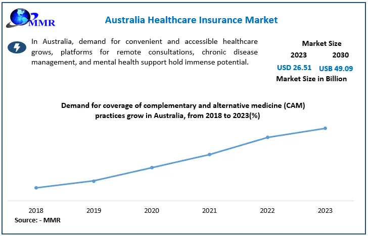 The Australia Healthcare Insurance Market size was valued at USD 26.51 Billion in 2023. The total Australian healthcare Insurance Market revenue is expected to grow at a CAGR of 9.2 % from 2023 to 2030, reaching nearly USD 49.09 Billion in 2030.