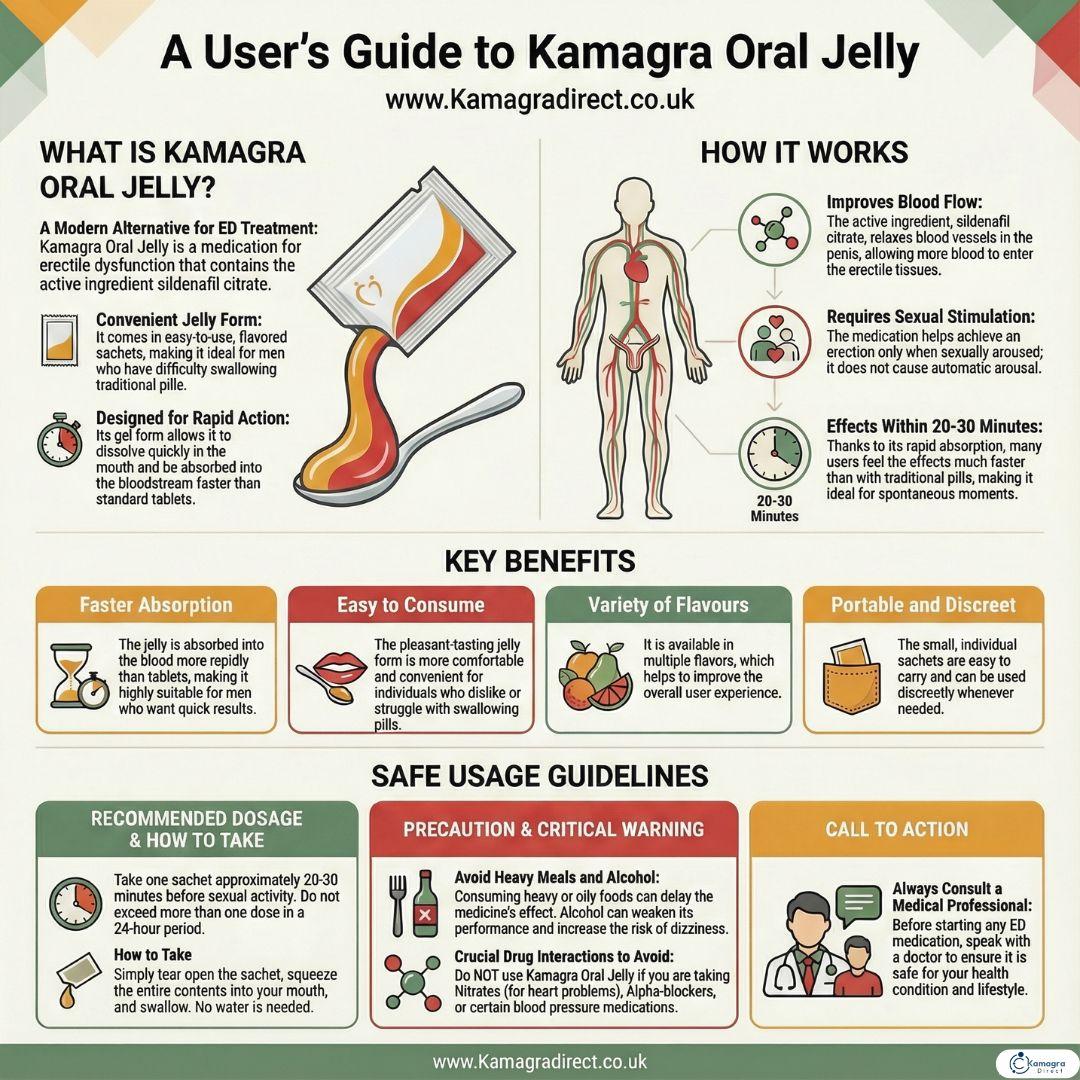This educational infographic provides a structured overview of Kamagra Oral Jelly, focusing on its formulation, method of use, and general considerations related to erectile dysfunction treatments. The visual guide explains what Kamagra Oral Jelly is, how it differs in form from traditional tablets, and why jelly-based delivery systems are used for certain medications.