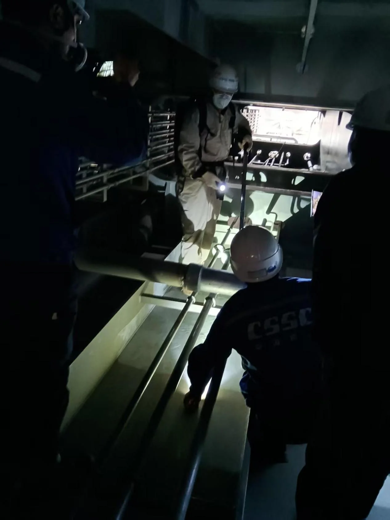 On the shipyard floor, workers are seen operating within enclosed ship hulls. The air is thick with fine dust, and surfaces are covered in a layer of mixed metal and coating particles. Traditional cleaning equipment simply cannot access the narrow passages and tight corners, often barely wide enough for one person, making thorough cleaning a near-impossible task.